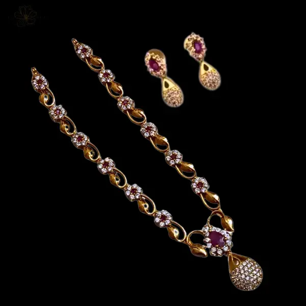 Delicate yet dazzling, the Blush Bloom Grace Set features a beautifully linked gold-tone necklace adorned with pink floral stones and a crystal-studded teardrop pendant. Paired with matching drop earrings, this set captures soft elegance — ideal for festive gatherings, wedding functions, or thoughtful gifts for your loved ones