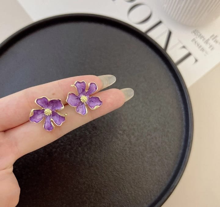 Bloom with elegance. These charming earrings feature delicate violet enamel petals outlined in gold, with a textured golden center that adds a hint of sparkle. Perfect for adding a graceful floral touch to any look, from daytime chic to evening glam.