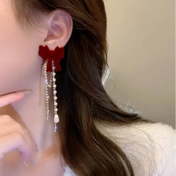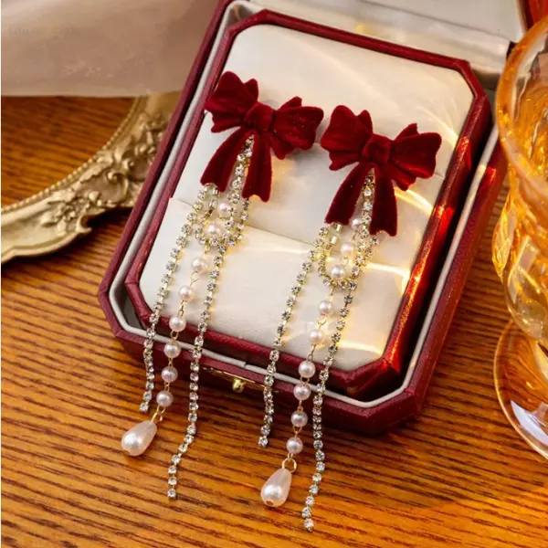 Add a touch of vintage romance to your look with these Velvet Grace Dangle Earrings. Featuring plush maroon velvet bows, shimmering crystal strands, and delicate pearl drops, these earrings are perfect for elegant evenings or festive occasions. Lightweight yet eye-catching, they blend classic charm with a modern twist.